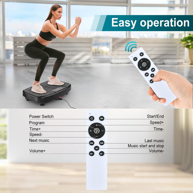 - The Vibration Plate remote controller made of high quality ABS material is durable, hard to break, and has excellent impact resistance and durability. The surface is glazing, smooth and comfortable to the touch, and easy to grip. Silicone buttons are soft and stick to your fingers, and have excellent durability and stain resistance.