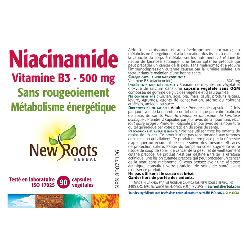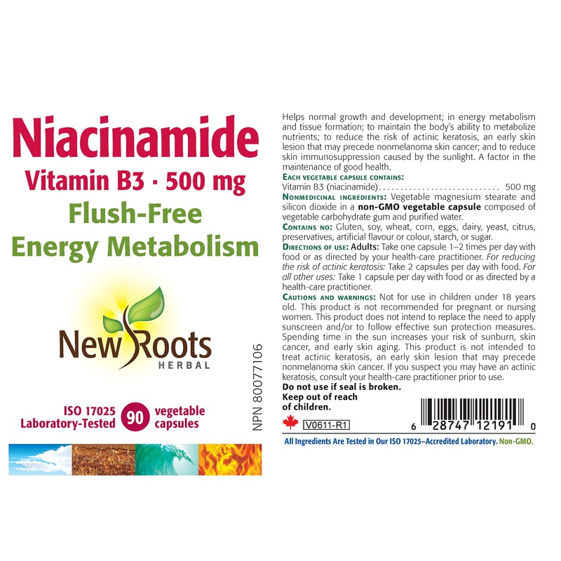 - HIGH-POTENCY NIACINAMIDE - Each vegetable capsule of New Roots Herbal contains 500 mg of niacinamide, providing a substantial dose of Vitamin B3.