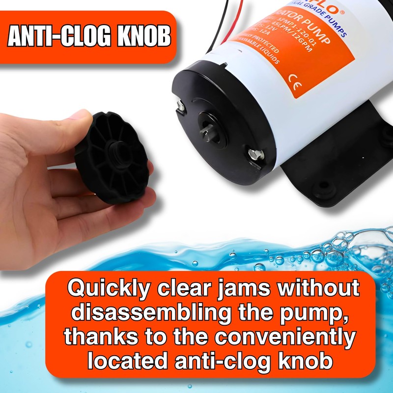 Features & Benefits Sealed Manual Turn Key Run Dry Capability New Four-bladed Dasign Thermally Protected Ignition Protected Typical Applications RV & Campers Boats & Mobile Kitchenware Industrial Marine PUMP Liquid Temperature:140°F (60°C) Max. Priming Capabilities :Not needed flooded suction Power:12 amps max current draw Max Pressure:Not needed: Inlet/Outlet Ports Inlet: 1.5" (39 mm) Hose Barb or thread fitting Outlet: 1" Hose Barb Weight:4.9 lbs (2.24 kg) MOTOR Type:High quality seamless design that is thermally protected Leads:Wire leads Temperature Limits:140°F (60°C) Max. Duty Cycle:Intermittent Voltage:12v