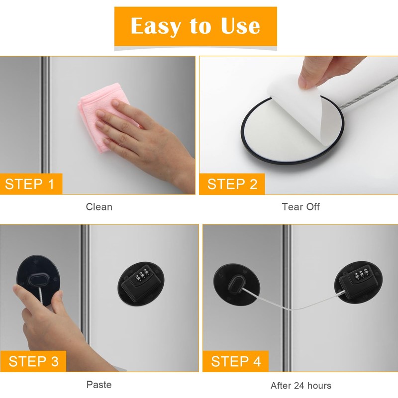 - [Easy Install]: Wipe the refrigerator door clean, peel off the adhesive paper on the back, and then stick the locks for fridge safety first onto the refrigerator, and then press firmly for a while, no need for any tools.
