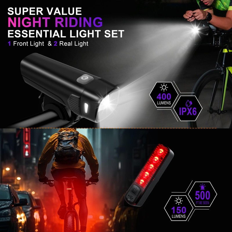 New Version 400-Lumen High-Brightness Bicycle Front and Rear Lights Set, Featuring 4+5 Lighting Modes for Night Riding. USB Rechargeable Bike Lights ,Suitable for Cycling.