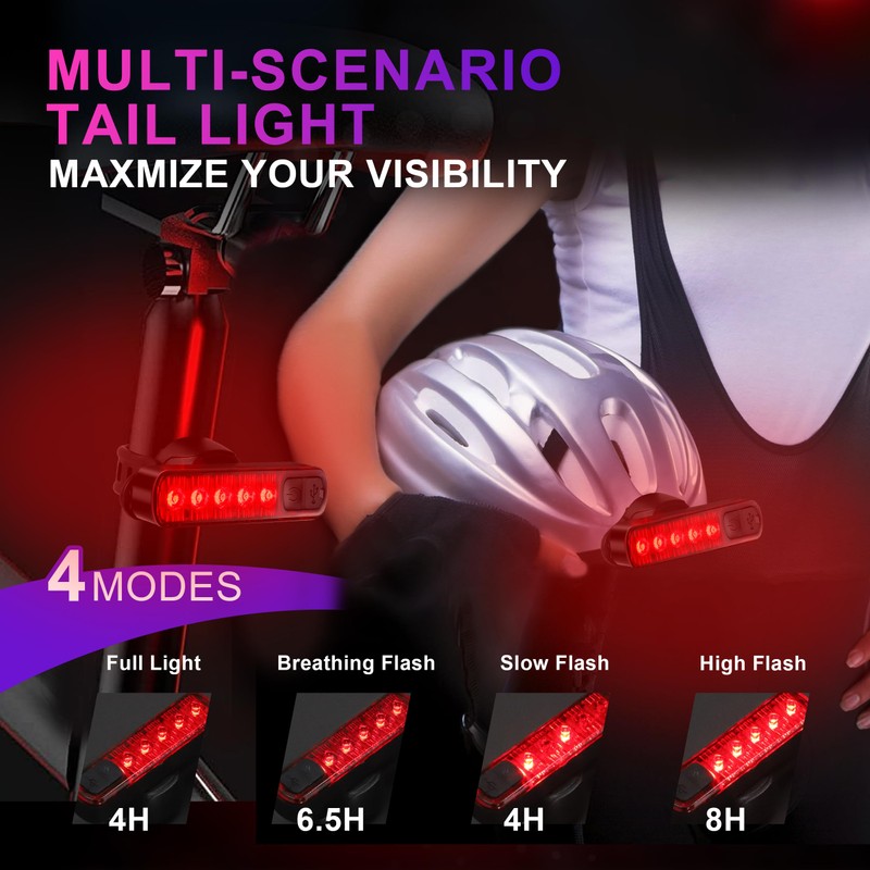 - HIGHLIGHT HEADLIGHT + TAILLIGHTS: The bicycle headlight boasts an ultra-high brightness of up to 400 lumens and a large capacity of 2000mAh, with a runtime of up to 7-8 hours; the taillight can last for 4-8 hours! These lights are ideal for use as navigation lights, signal lights, or safety lights. Whether you're walking the dog, riding a bicycle, skateboarding, camping, or hiking, these safety lights will ensure your safety.
