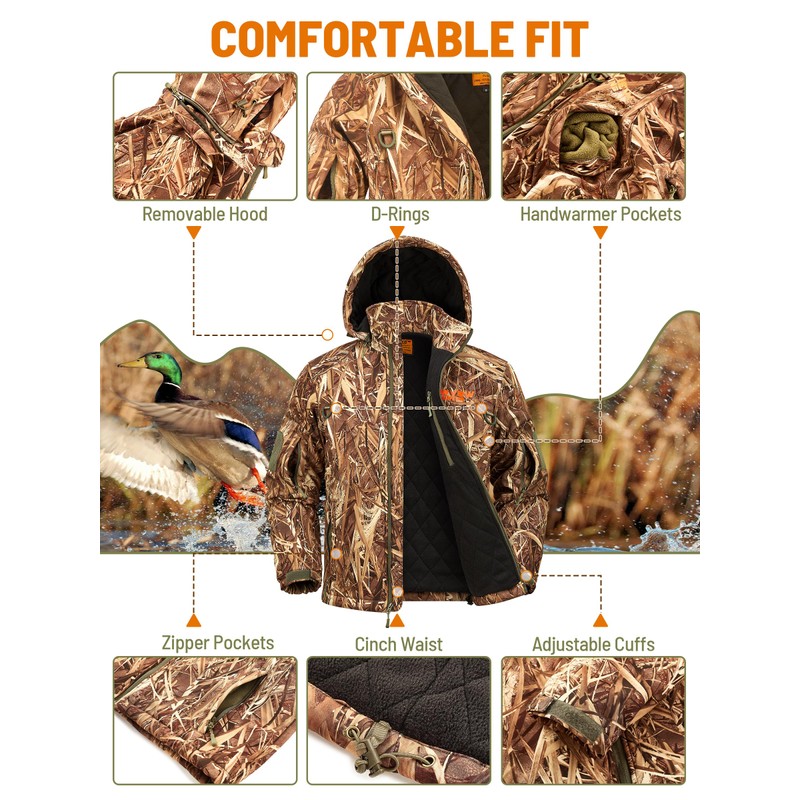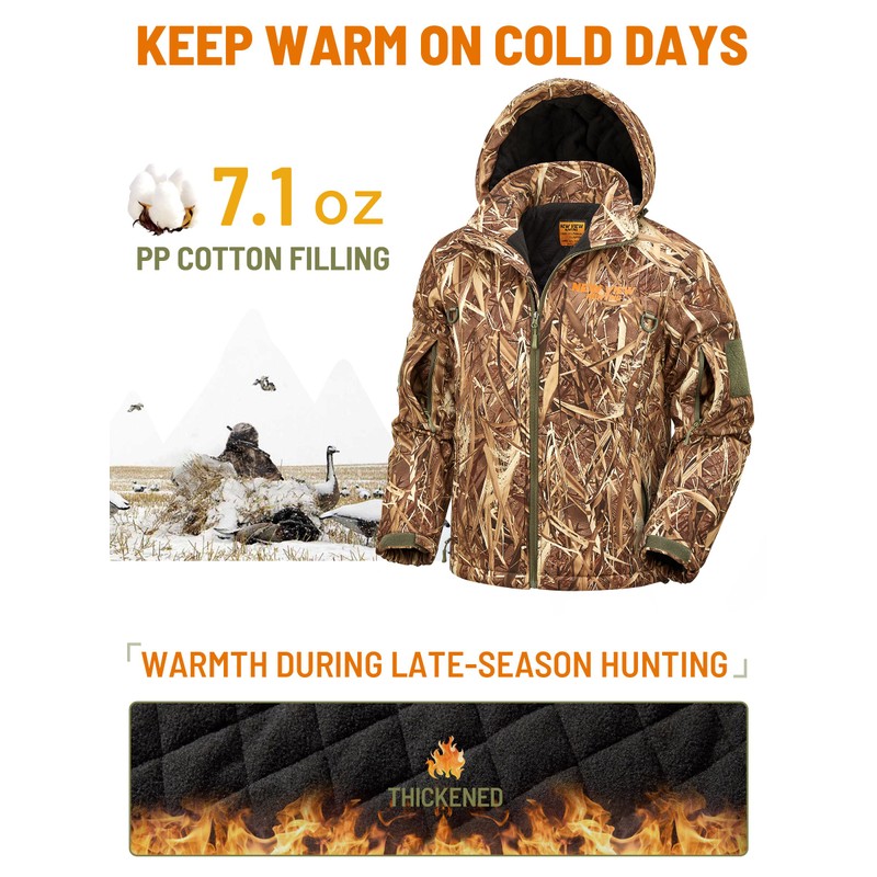 - Super Warm: This thick hunting jacket made from durable polyester. Water resistant windproof softshell and soft fleece lining protect from the elements, and the PP cotton insulation adds warmth. Stay warm and comfortable during late season and winter bow hunts with mens hunting clothing