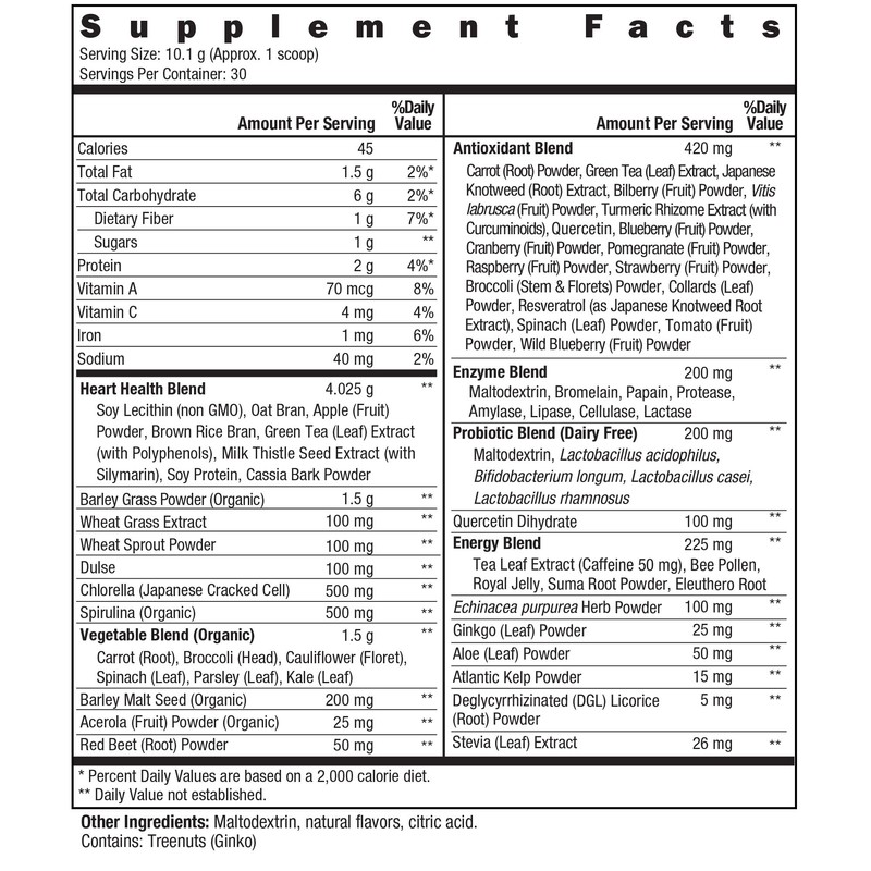 - 🥕 IT’S LIKE 6 FORMULAS IN 1: Every serving delivers the power of an organic vegetable blend, an antioxidant blend, an enzyme blend, a dairy-free probiotic blend, a heart health blend, and an energy blend. Honest, natural ingredients fuel this nutritional formula and gives you the vegetable supplement you need.