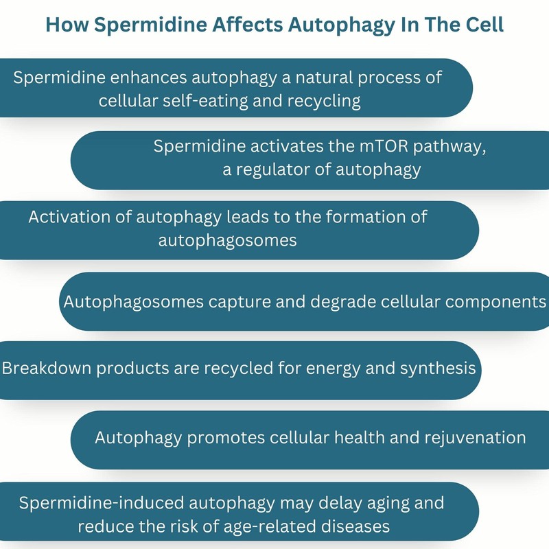 - PROMOTING LONGEVITY: Spermidine may promote the formation of autophagosomes, which are responsible for the degradation and recycling of damaged cells and organelles. This, in turn, helps in preventing and slowing down the aging process.
