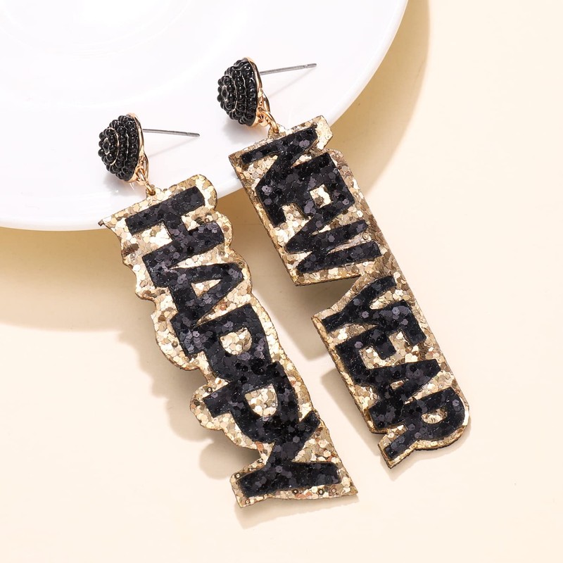 - It's that time of year again! Enter the new year in style with some sparkle-filled party accessories,perfect for your new year celebrations.Ring in the new year with these New Year's Eve earrings,Featuring Black and Gold words of "HAPPY" for one earrings and "NEW YEAR" for the other,These are the perfect holiday earrings for your NYE party!