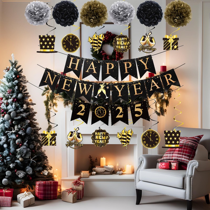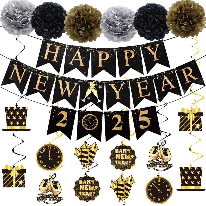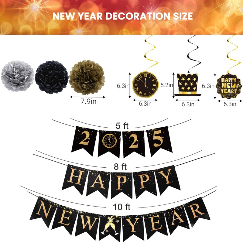 - 🎄A set perfect for your Happy New Year party decoration. Fill your New Year party with festive cheer! These New Year decorations are easy to assemble and hang, both kids and adults can enjoy DIY fun.