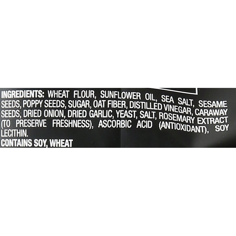 New York Style Bagel Crisps, EVERYTHING - Best Baked Crisps Will Make Your Day The authentic twice baked bagel crisps are irresistible in taste and have aroma of authentic New York Bakeries is in every bag. You can eat it right out of bag or add some crunch to your soup or salad and even garnish with some cheese and have with dips. The perfect party time snack made in US. Ingredients: Wheat Flour Mid-Oleic Sunflower Oil and/or Palm Fruit Oil Sea Salt Sesame Seeds Poppy Seeds Sugar Oat Fiber Distilled Vinegar Caraway Seeds Dried Onion Dried Garlic Yeast Rosemary Extract (Antioxidant) Ascorbic Acid (Antioxidant) Soy Lecithin Contains: Soy & Wheat