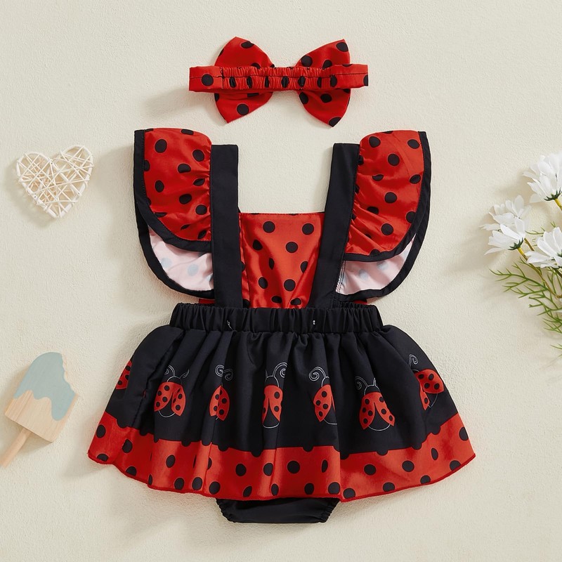 Newborn Baby Girl Summer Clothes Ruffle Fly Sleeve Romper Dress Onesie with Headband Toddler Infant Outfit (A Red Ladybug, 0-3 Months)