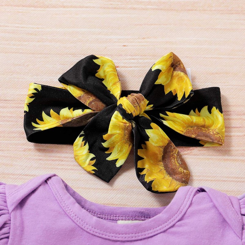 Newborn Infant Baby Girl Outfit Short Sleeve Letter Print Romper Bodysuit Sunflower Pants Headband 3Pcs Clothes Set (Purple,18-24 Months)