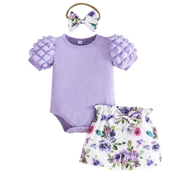 Newborn Infant Baby Girl Summer Clothes Ribbed Short Sleeve Romper Floral Shorts Headband 3Pcs Outfits Set 0-18 Months(Purple,3-6M)