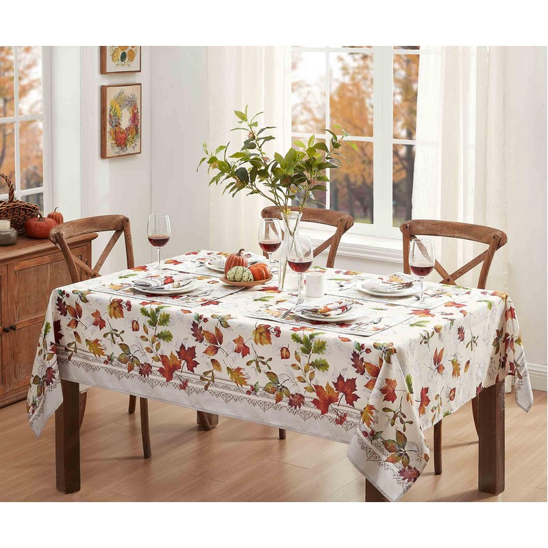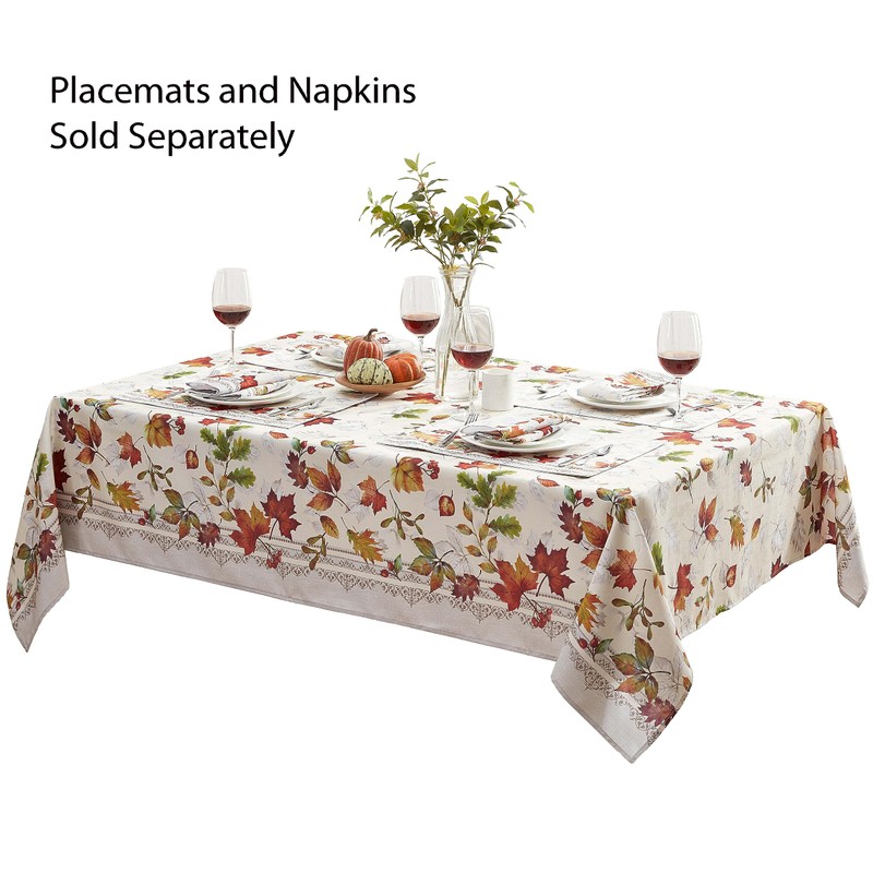 - STYLING: The Newbridge Autumn Essentials Fall Foliage Bordered Fabric Thanksgiving Tablecloth features a vivid rust, orange, taupe and green swirling leaves of autumn on a creamy beige background with a two tone taupe scroll filigree border.