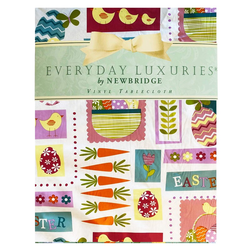 - STYLING: The Newbridge Easter Spring Expressions Mod Patchwork Vinyl Flannel Backed Spring Tablecloth features an allover patchwork pattern featuring bright and bold Easter Eggs, Baskets, Little Chicks, and Mod Flowers on a white background.