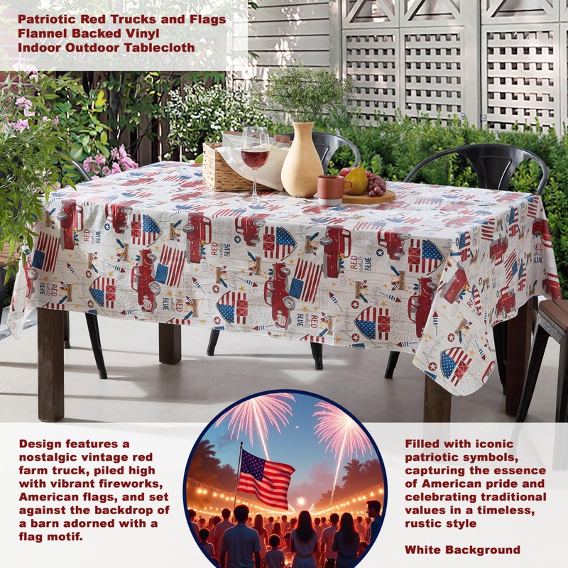 - STYLING: Newbridge Patriotic Truck Red, White and Blue Vinyl Flannel Backed Tablecloth, features a vintage Red Farm Truck with a load of fireworks, American Flags, Barn with aflag design and other patriotic American images on a white background