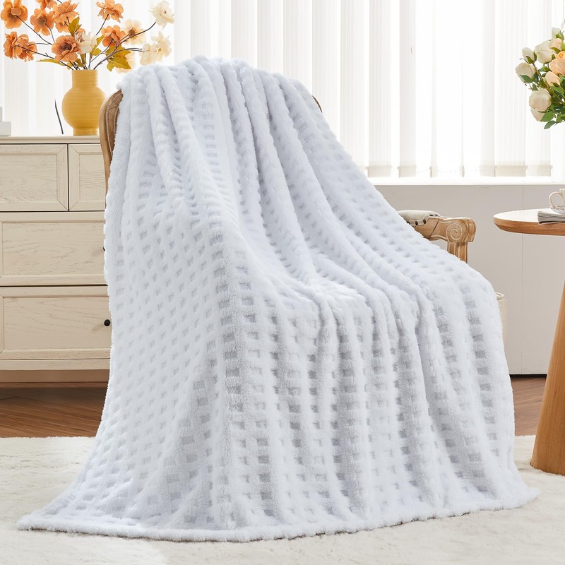 NEWCOSPLAY Super Soft King Blanket White Premium Silky Flannel Fleece 3D Waffle Checkered Lightweight Bed Blanket All Season Use (White, King(90"x110"))