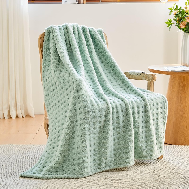 NEWCOSPLAY Super Soft Throw Blanket Green Premium Silky Flannel Fleece 3D Waffle Checkered Lightweight Bed Blanket All Season Use (New Sage Green, Throw(50"x70"))