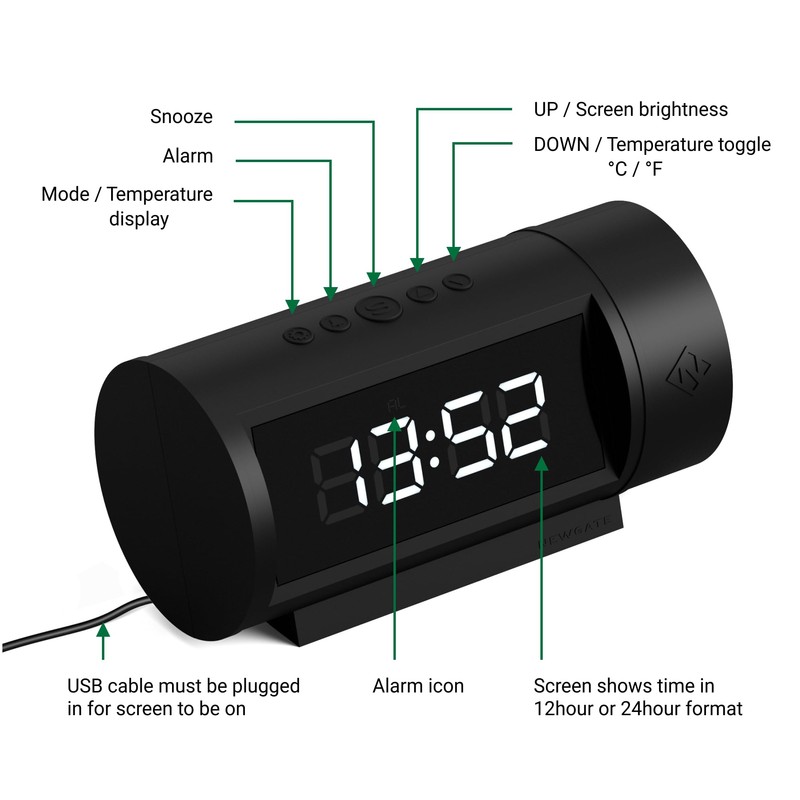 - 3 x AAA batteries (not included) are required to retain time and alarm settings