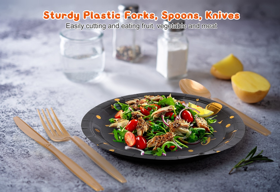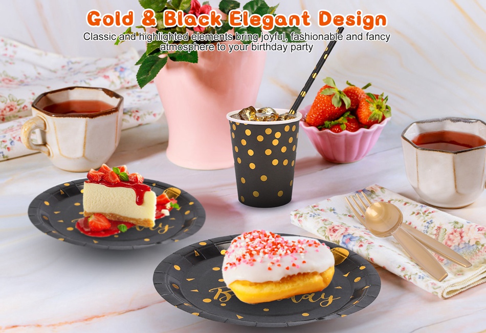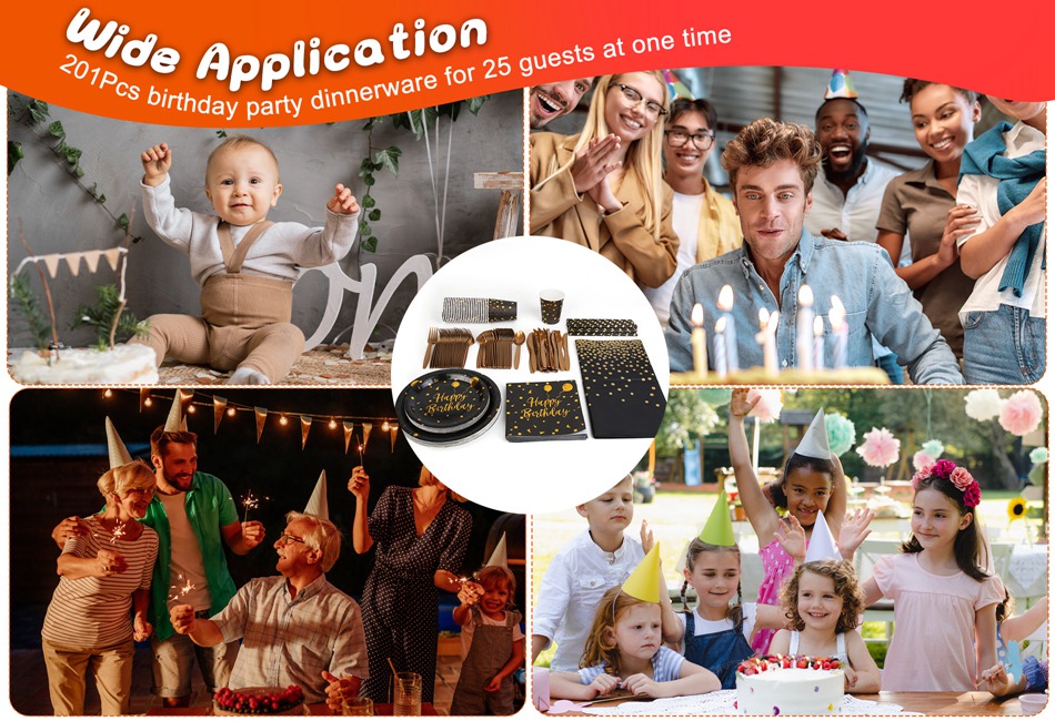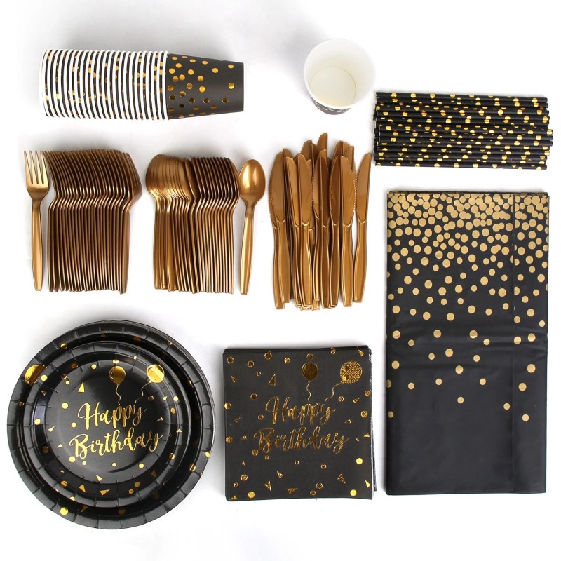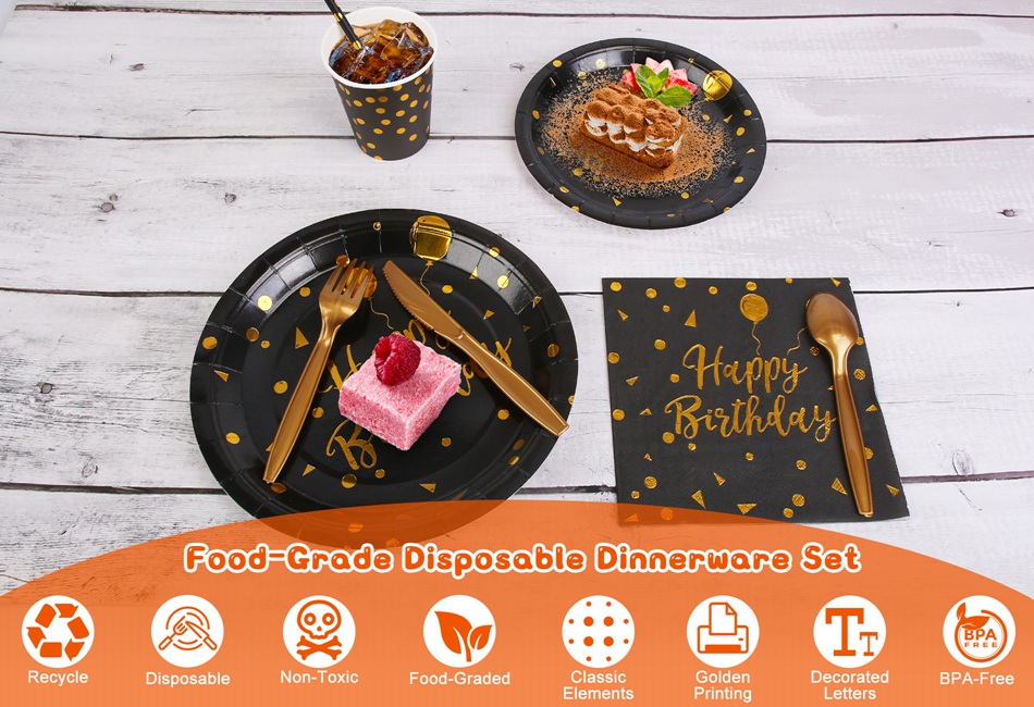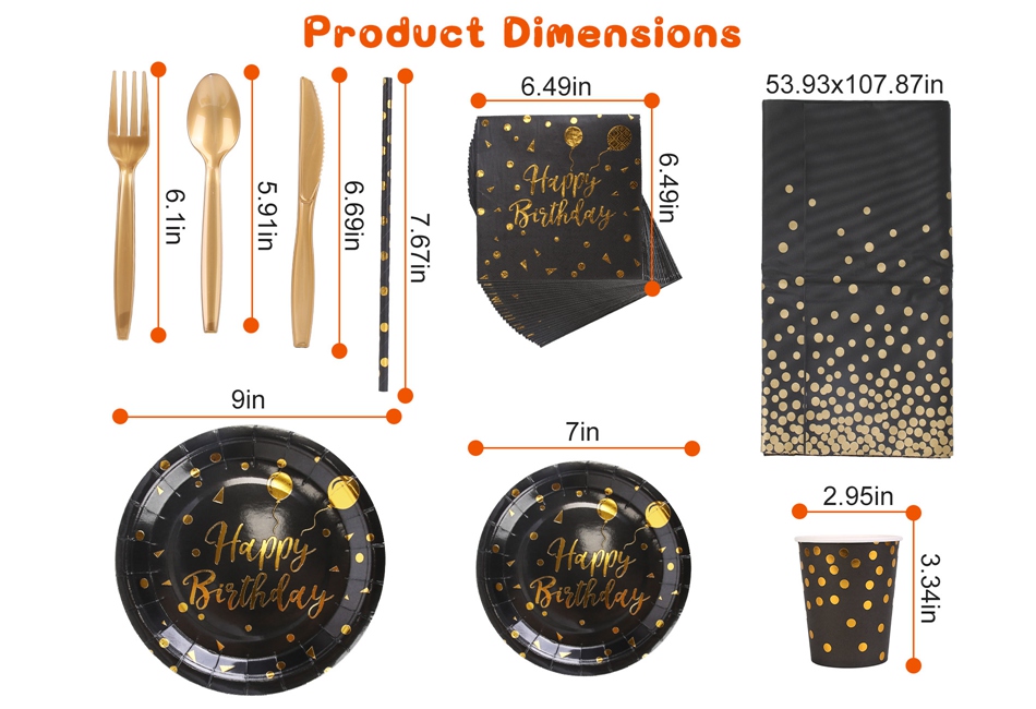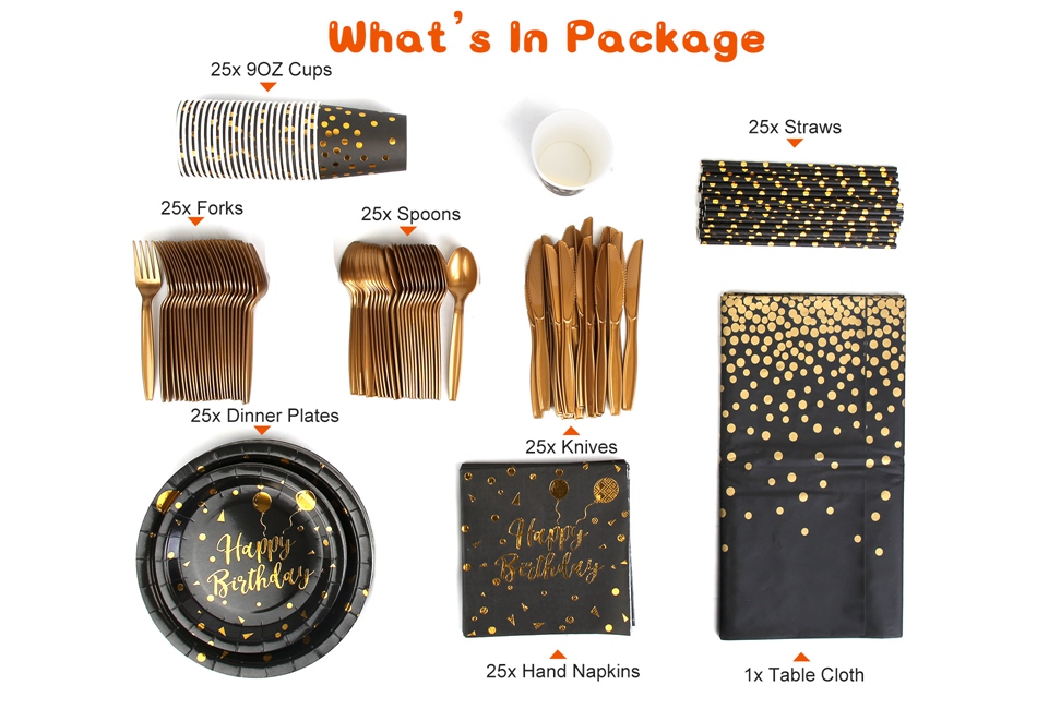 GOOD QUALITY Featured Item Product Detail Image GalleryProduct DescriptionOverview: A grand birthday party must have elegant dinnerware set to match with. Our 201pcs black and gold birthday dinnerware set, included plates, forks, spoons, knives, napkins, cups, straws and tablecloth, can serve 25 guests at one time. The black background of plates are printed with golden dots, triangles, balloons and “Happy Birthday” message in decorated letters, highlighted and classic elements add joyful and fancy atmosphere to your birthday. Made of recycled paper and food-grade plastic, these disposable birthday party supplies are safe, and after use, you can easily throw them away to save time and effort of laborious cleaning job. Choose our elegant disposable birthday dinnerware set so as to spend more time to enjoy happy moment with family and friends. Features:
