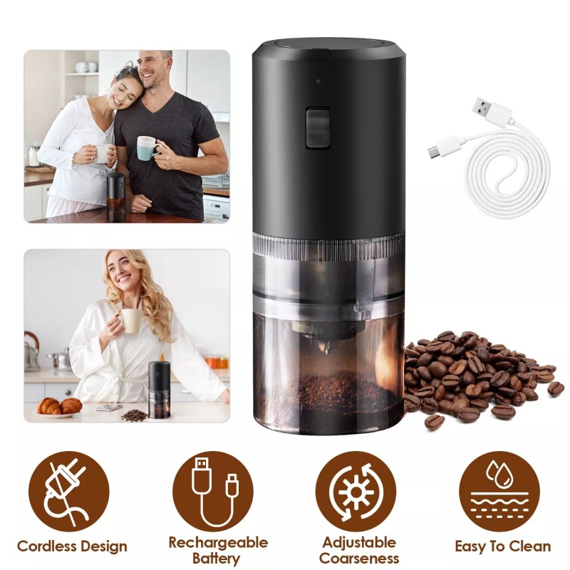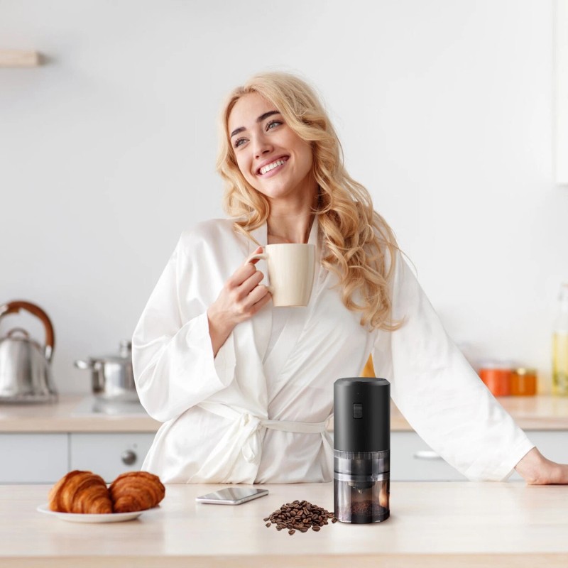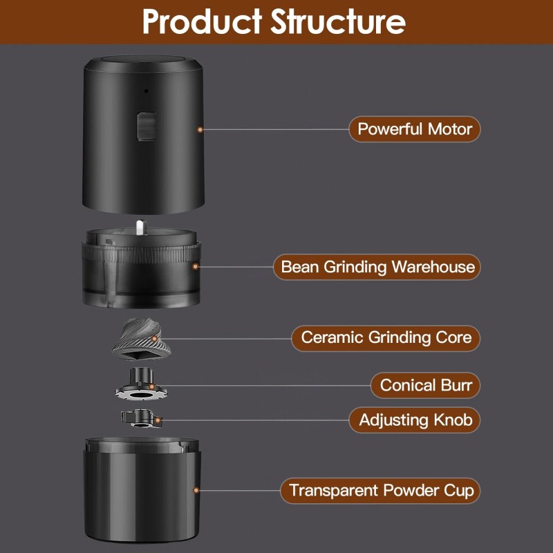 GOOD QUALITY Featured Item Product Detail Image GalleryProduct DescriptionOverview: Featured with ceramic core, our electric coffee grinder is designed to deliver quick and even grinding, while preserving flavor and aroma of your coffee beans. Rotate the ceramic core can adjust the 5 different coarseness, allows you to customize the grind to suit your taste preferences. Built-in 1200mAh battery supports approximately 30 to 50 coffee grinding sessions on a single charge, no worrying about the sustainability during outdoor activities. When it's time to clean, simply disassemble the grinder for thorough cleaning and maintenance. A must-have tool for all your culinary adventures. Features: