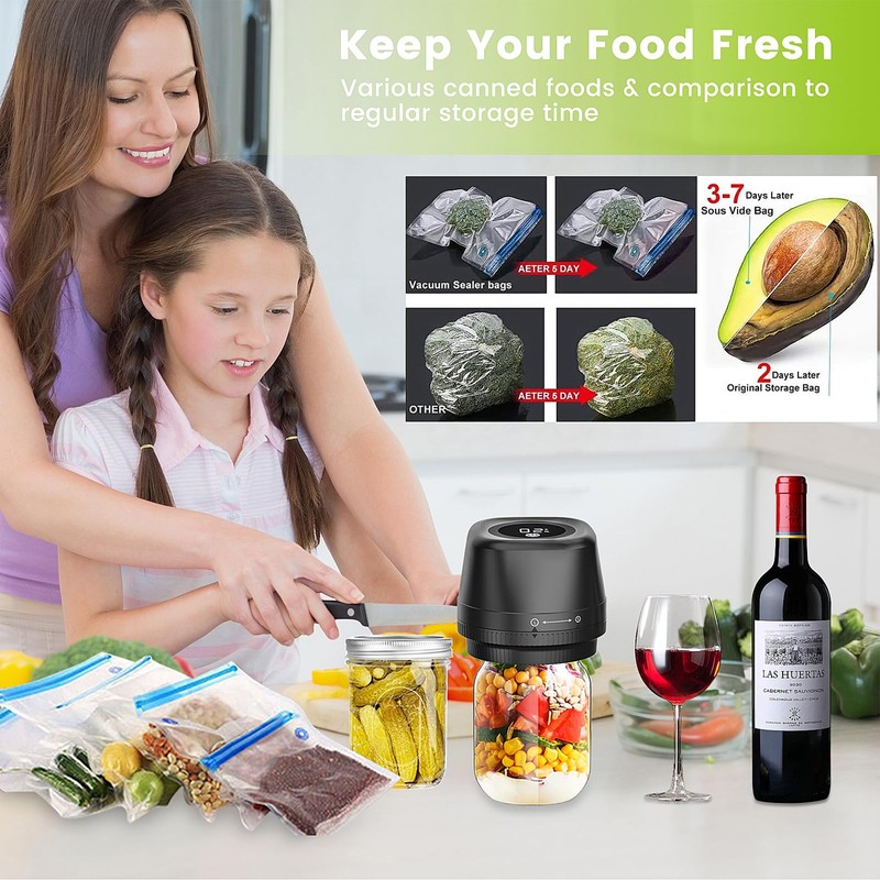 - Meet Your Sealing Needs: Includes an electric mason jar vacuum sealer, 5 regular and 5 wide-mouth Mason jar lids, 1 vacuum bag, 1 silicone stopper for red wine, 1 lid opener, 1 type-c charging cable, 1 user manual, 1 vacuum nozzle. Keep your food fresh longer with this all-in-one solution