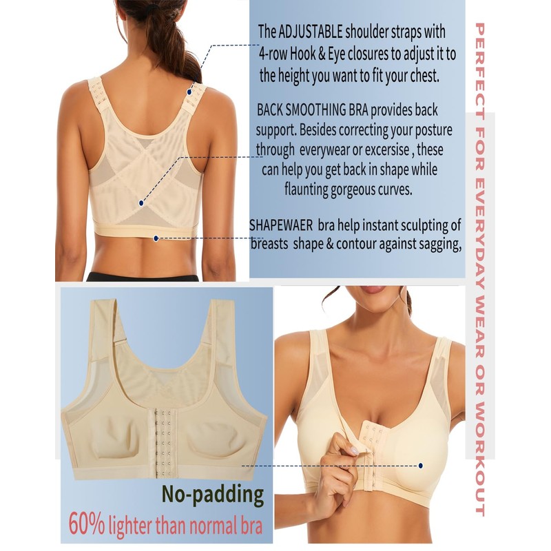 newlashua Front Closure Bras for Women Posture Corrector Bra Back Support, Wireless Full Coverage Back Smoothing Bra L Nude