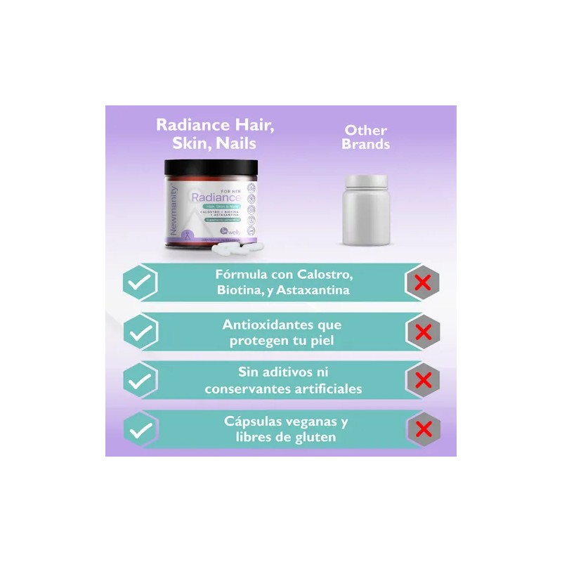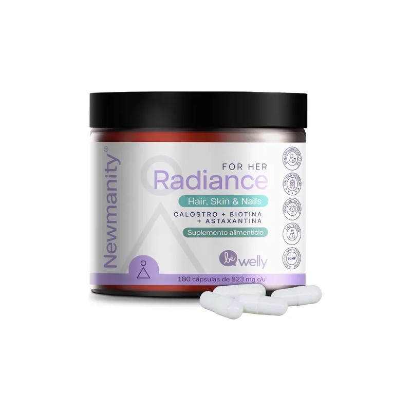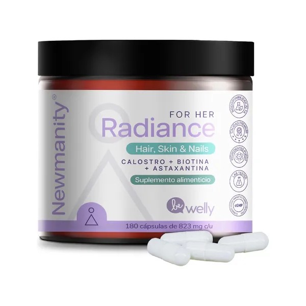 Newmanity Radiance es un suplemento premium que combina colágeno, omega 3 y biotina para nutrir tu piel, cabello y uñas desde el interior 🌟👩🦰💅.