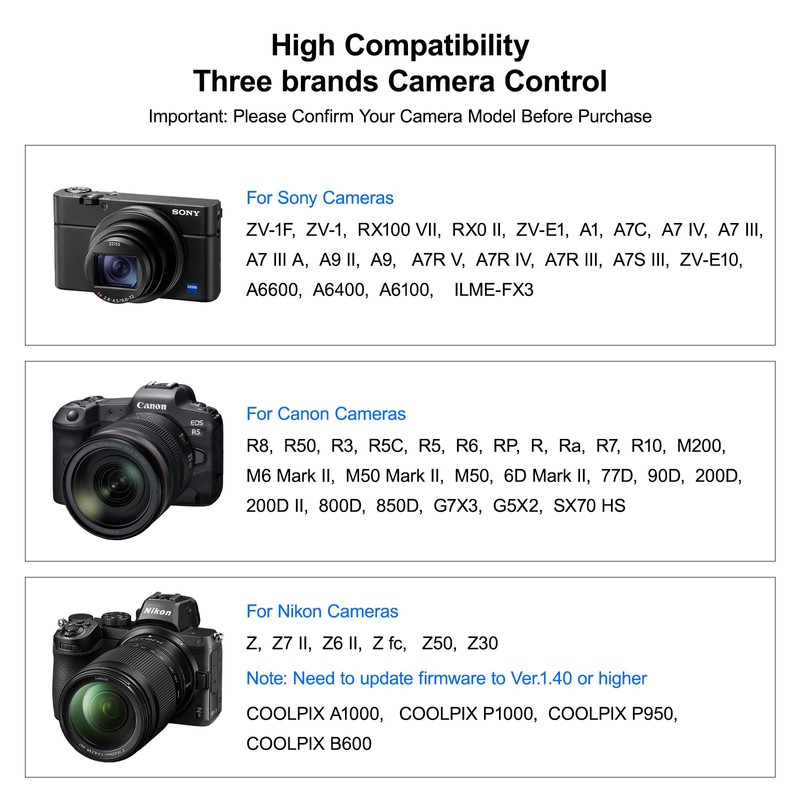 - Compatible withSony ZV-1F,ZV-1,RX100 VII,RX0 II,ZV-E1,A1,A7C,A7 IV,A7 III,A7 III A,A9 II,A9,A7R V,A7R IV,A7R III,A7S III,ZV-E10,A6600,A6400,A6100,ILME-FX3; Canon R8,R50,R3,R5C,R5,R6,RP,R,Ra,R7,R10,M200,M6 Mark II,M50 Mark II,M50,6D Mark II,77D,90D,200D,200D II,800D,850D,G7X3,G5X2,SX70 HS; Nikon Z,Z7 II,Z6 II,Z fc,Z50,Z30,COOLPIX A1000,P1000,P950,B600.Note:Please confirm your camera model before purchase.Nikon Z,Z7 II,Z6 II,Z fc,Z50,Z30 must update firmware to Ver.1.40 or higher.