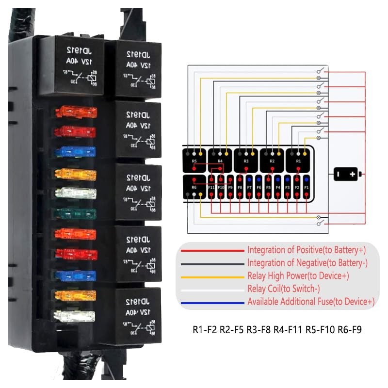 - 【Safe and Durable】:This 12v automotive relay box will be equipped with 6 x 4-pin 40A relays that offer the highest capacitance,The shell is made of high-quality flame-retardant nylon material, which has excellent heat resistance and impact resistance,metal pins for good durability and corrosion resistance. The internal wiring is made of high quality copper core with low resistance and high conductivity efficiency, making it easy for you to use and safer!