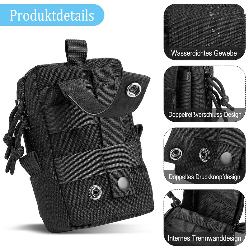 - FLEXIBLE MOLLE ATTACHMENT SYSTEM Thanks to the Molle Pouch attachment, the bag can be securely attached to belts, backpacks or tactical gear. In addition, a carabiner hook (4.5 x 2.4 cm) is included to flexibly attach the bag to bicycles or hiking backpacks