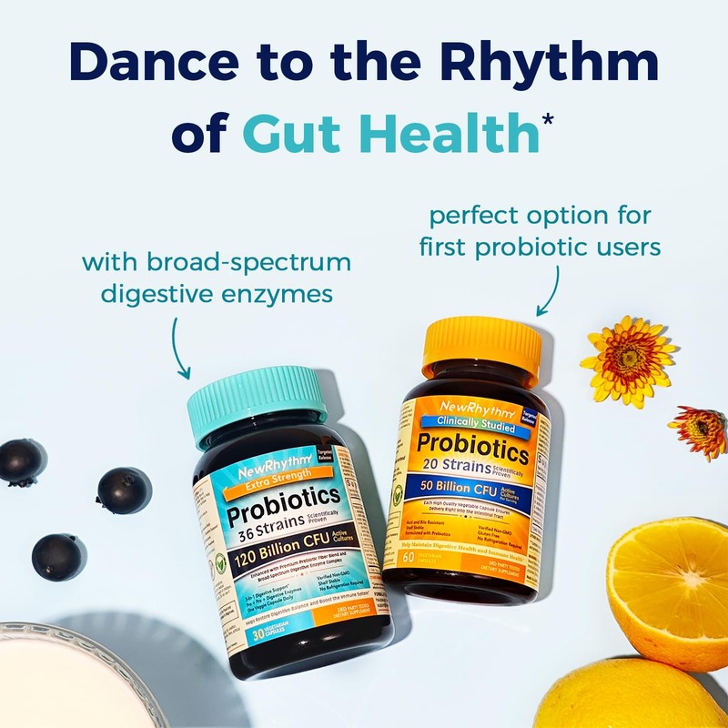 • Digestive Enzymes with Probiotics and Prebiotics - NewRhythm Probiotics for Digestive Health Delivers 120 Billion CFU Probiotics, 150 mg Premium Prebiotic Fiber, and Broad-Spectrum Digestive Enzymes to Ensure You Get All You Need for Your Overall Digestive Support and Immune Boost.* Featuring Targeted Release Technology Helps Probiotics Survive Stomach Acids and Reach Your Intestinal Track.