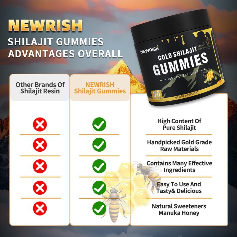 - Newrish Gold Shilajit Gummies - 100% Natural & Organic - 30 Gummies with Manuka Honey Fulvic Acid & 85+ Trace Minerals for Enhanced Athletic Performance - Fitness
