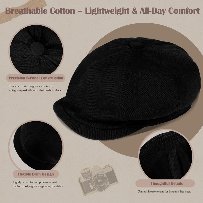 Newsboy Hats for Men Women - Classic 8-Panel Flat Ivy Cabbie Cap, Lightweight for Daily Wear Black