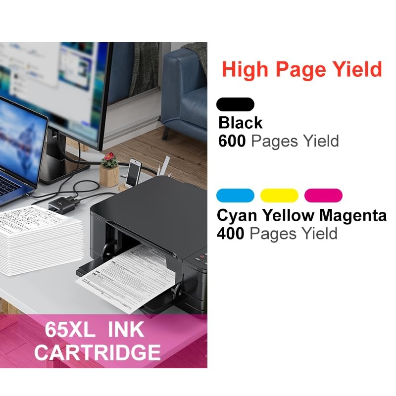 - Page Yield:65XL black ink cartrige can print 650 pages, 63xl tricolor ink cartridge can print 400 pages based on A4 size 5% coverage rate
