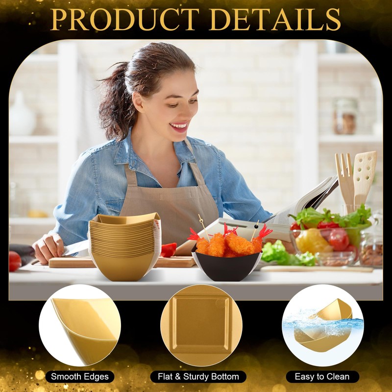 - What You Will Get: you will get 50 pcs of square serving bowls and 50 pcs bamboo cocktail picks, 2 different colors in gold and black, 8 ounces, suitable foods include generally snacks, salads, sauces etc; Whether you're hosting a salad bar, serving snacks, candies, chips, or even using them for arts and crafts, these black and gold serving bowls meets your needs