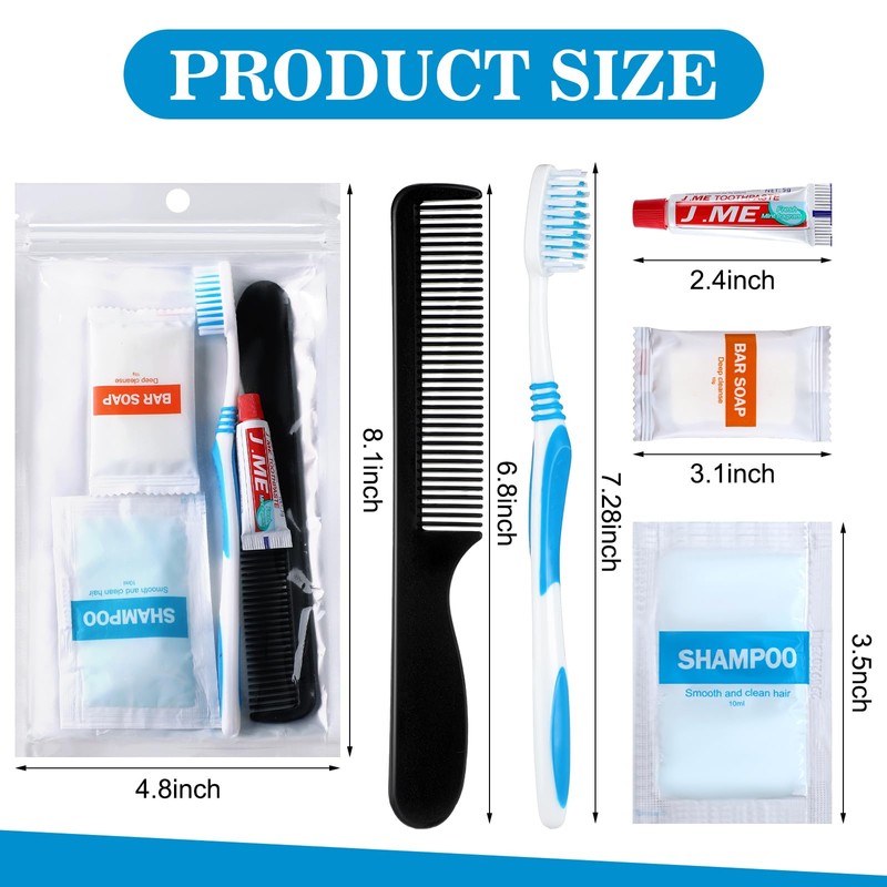 - Abundance of Basic Hygiene Components: this travel toiletry kit is available in 48 sets that include 48 soap, 48 toothbrushes, 48 toothpastes, 48 shampoos, and 48 combs; It's a suitable hygiene solution for large gatherings, hotels, homeless shelters, or disaster relief operations, providing sufficient supplies for everyone's sanitation needs; Each kit is packaged in a sealing bag