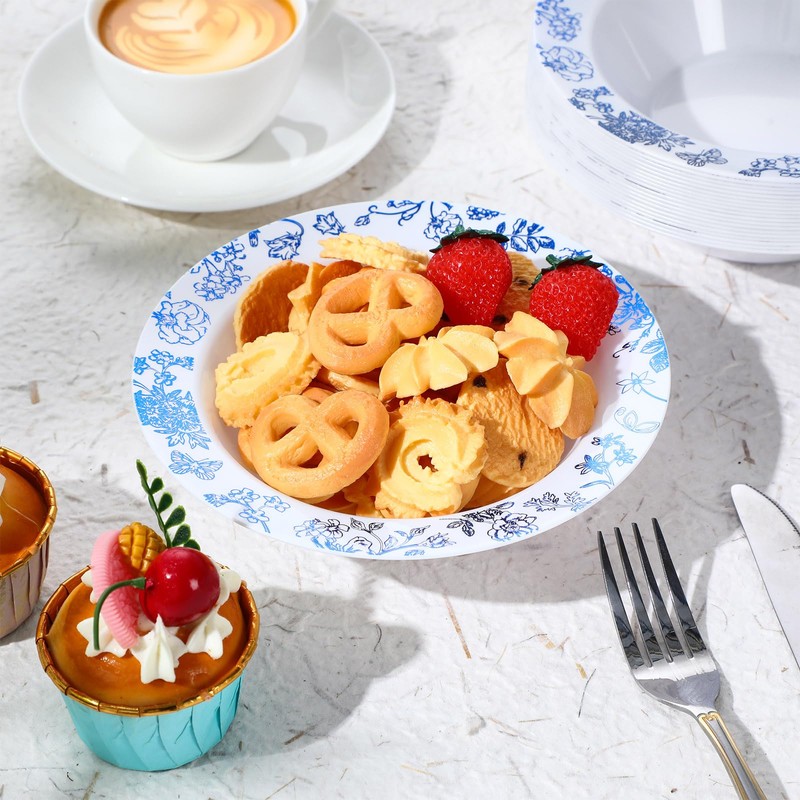 - Elegant Floral Rim Design: these white dessert bowls come with delicate blue floral rims, which are both practical and stylish, suitable for both formal dinners and casual family gatherings, adding a touch of style to your gatherings; The wide rim design ensures a comfortable grip, convenient and safe, no need to worry about burns when using