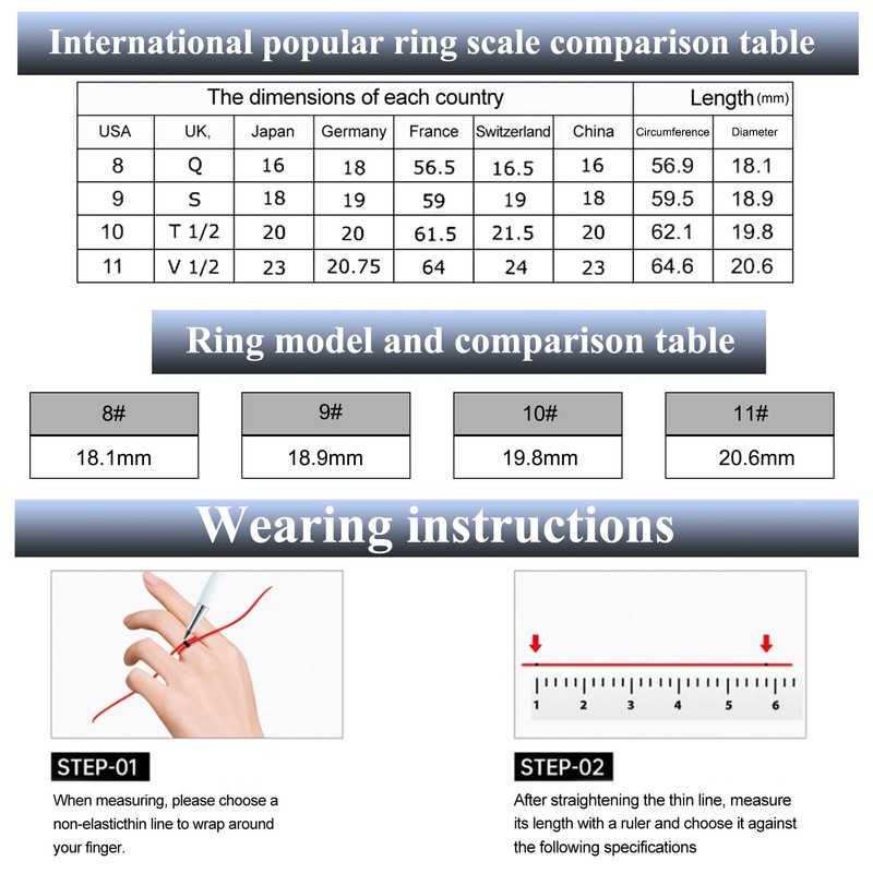 - [Right Size for You] Refer to the standard ring sizes (second picture)to choose the right size for you. Size 8, 9, 10, 11 are available.
