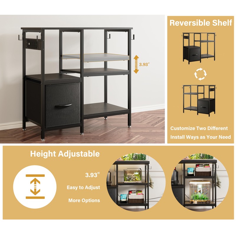 - Adjustable P2 Panel : The 4-tier storage shelves support 10, 20, and 29-gallon fish tanks or smaller aquariums, offering versatile placement options. The right side of the second shelf features an adjustable panel that can move up or down by 3.93 inches, accommodating equipment or decorations of different heights for better customization and organization