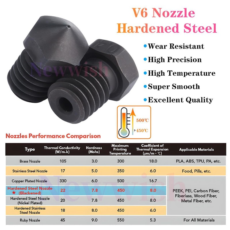 - The Hardened steel nozzles,each of which is molded by five axle CNC.Strict quality control enables it to possess Higher temperature,Higher Wear Resistance,Better Durability,More Precise (Tolerance 0.01 mm).Can be perfectly compatible with special filaments such as PEI, PEEK, PETG, Carbon Fiber Mixture,Glass Fiber Mixture, Filled PLA or Glow-in-the-dark filament.