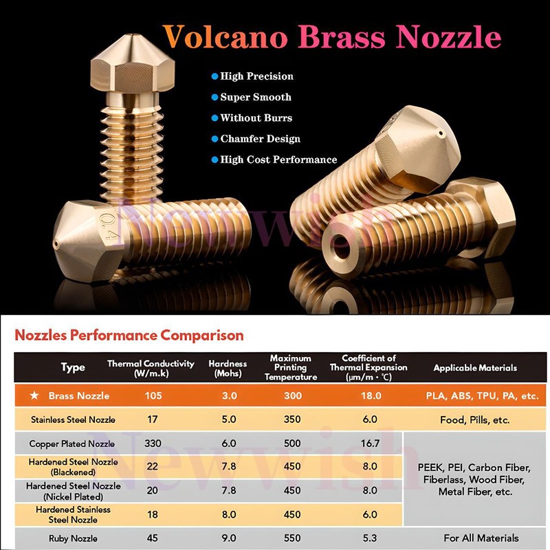 - 1: We choose the best materials that we can find on market combined with high precision CNC maching to bring this high quality volcano brass nozzle,high flow,sleek inner wall,smooth filament feed-out,no burrs, lower viscosity, smooth filament-pushing. Brass nozzle high cost performance, Suitable for printing PLA ABS TPU PA and other conventional materials.