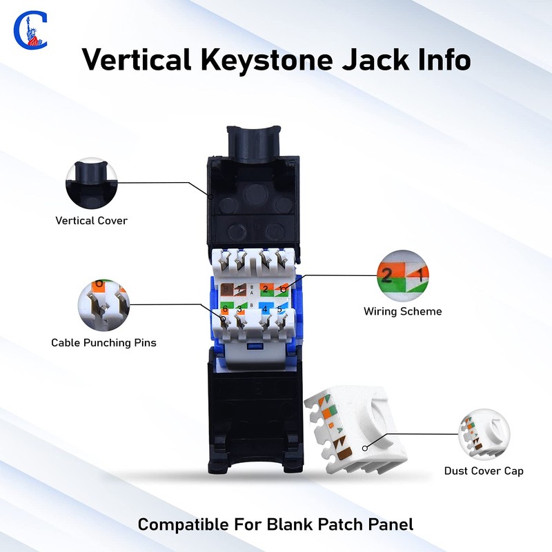 - ✅EASY TO USE TOOL-LESS DESIGN: The vertical RJ 45 keystone jack features a tool-less design that is easy to install and long-lasting. On the side, the jack features TIA 568 A/B color-coded wiring scheme and easy snap-in retaining clips for the easiest installation and an uninterrupted network. Once the wires are connected to the keystone jack, just close the cap to keep it dustproof. The body of the jack is made from rigid materials to withstand the uncertainties of the environment.