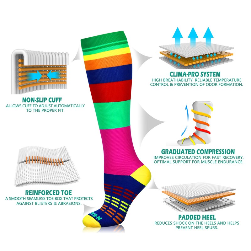 • PROMOTES BLOOD FLOW & CIRCULATION – Compression (20-30 mmHg) Socks deploy "graduated" compression—they squeeze more and more tightly the farther they are from the heart. These colorful compression socks can help reduce blood pooling in the legs and speed up the return of blood to the heart. Stimulating blood flow helps improve oxygen delivery to your muscles, which speeds up muscle recovery, helps prevent cramping, swelling, spider veins, and circulation issues common among diabetics.