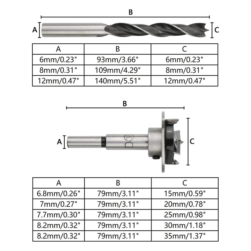 - WOOD DRILLING BITS KIT: Package includes 5 x Forstner Drill Bits (15/ 20/ 25/ 30/ 35mm), 3 x Twist Drill Bits (6/ 8/ 12), 1 x Storage Case, 1 x Wrench.