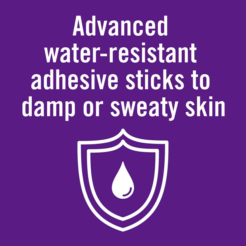 - Advanced water-resistant adhesive sticks to damp or sweaty skin