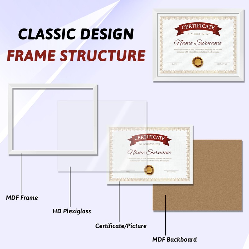 - Easy to Use Frame: The backboard of these black/white/gold document frames are secured with flip tabs and can be easily installed or removed with the included gadget. There are two wall hangers on the backboard, you can match them horizontally or vertically into collage picture frames, create your unique photo wall.