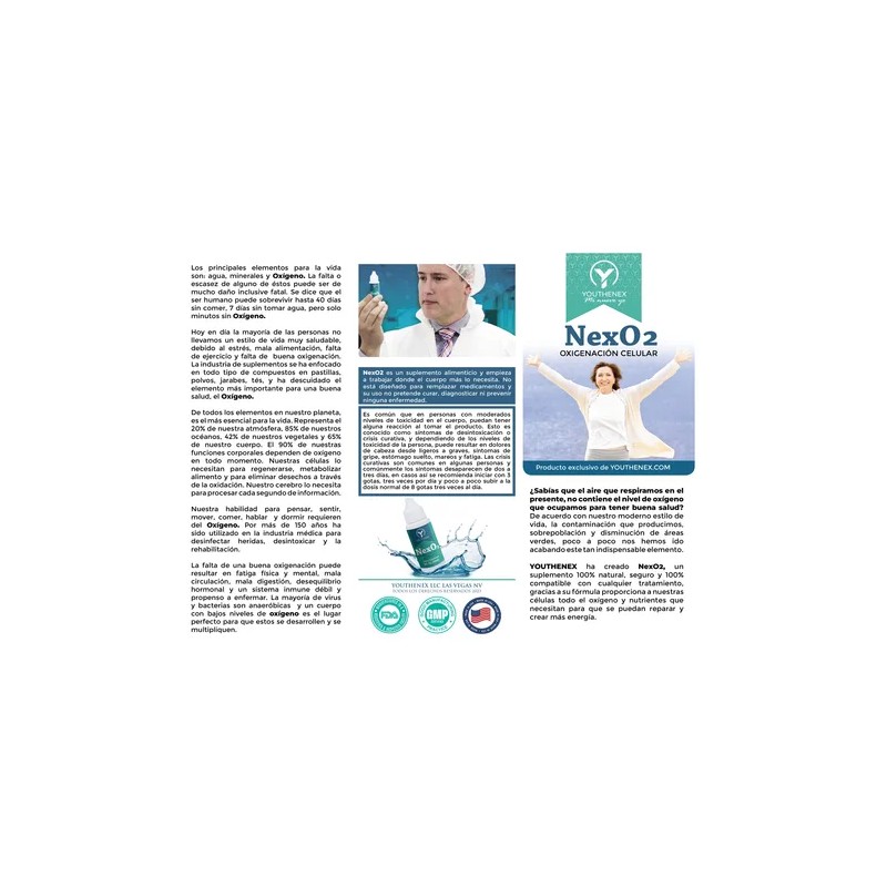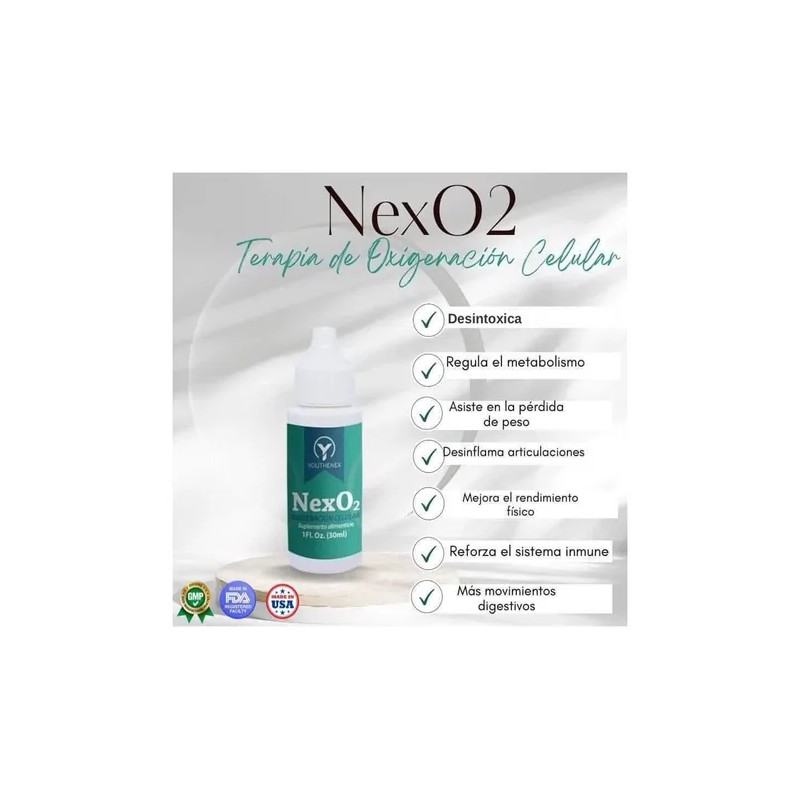 Nexo2 de YOUTHENEX es un innovador producto diseñado para la oxigenación celular, presentado en un práctico formato de gotero de 30ml que rinde para un mes de uso.