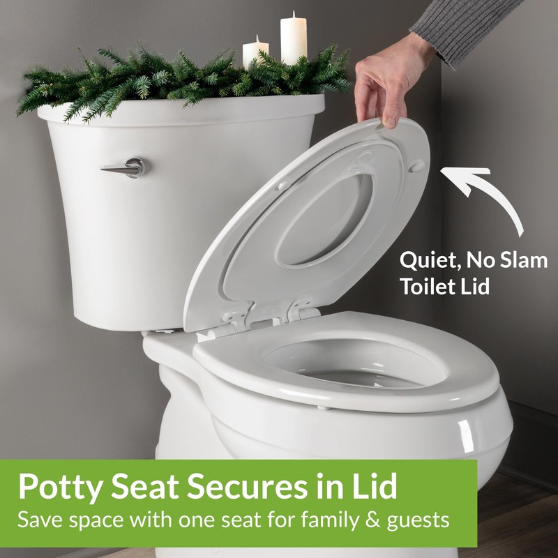 - CLUTTER FREE: Built-In plastic toddler potty seat secures magnetically in cover when not in use to keep the bathroom clean and organized