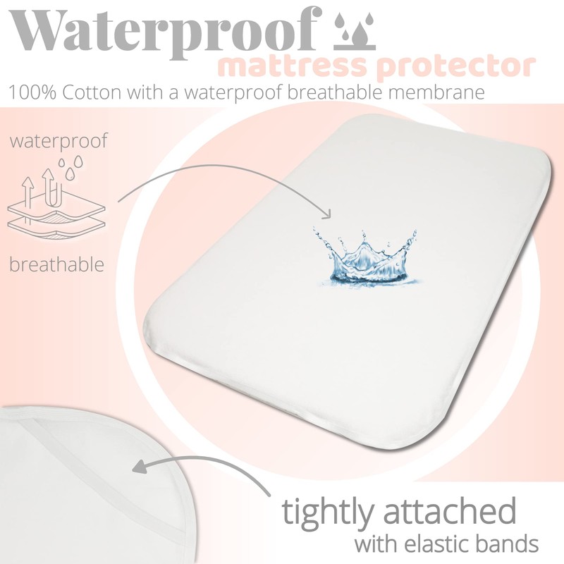 - ✔️ WATERPROOF FITTED MATTRESS PROTECTOR - Shield your baby's mattress from moisture and stains with our exceptional waterproof fitted mattress protector. Constructed from 100% cotton, this protector is completely waterproof and features a breathable silicone membrane. It is tightly attached with elastic bands to ensure a perfect fit. To use, wrap the protector around the crib mattress and add one of our crib sheets.