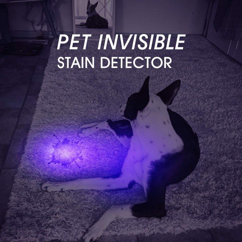 - 【Find invisible stains】 405nm UV blacklight flashlight urine light detector for dogs,cats, helps detect food stains and pet urine stains on rugs, carpets, and clothes that are otherwise invisible to the naked eye.