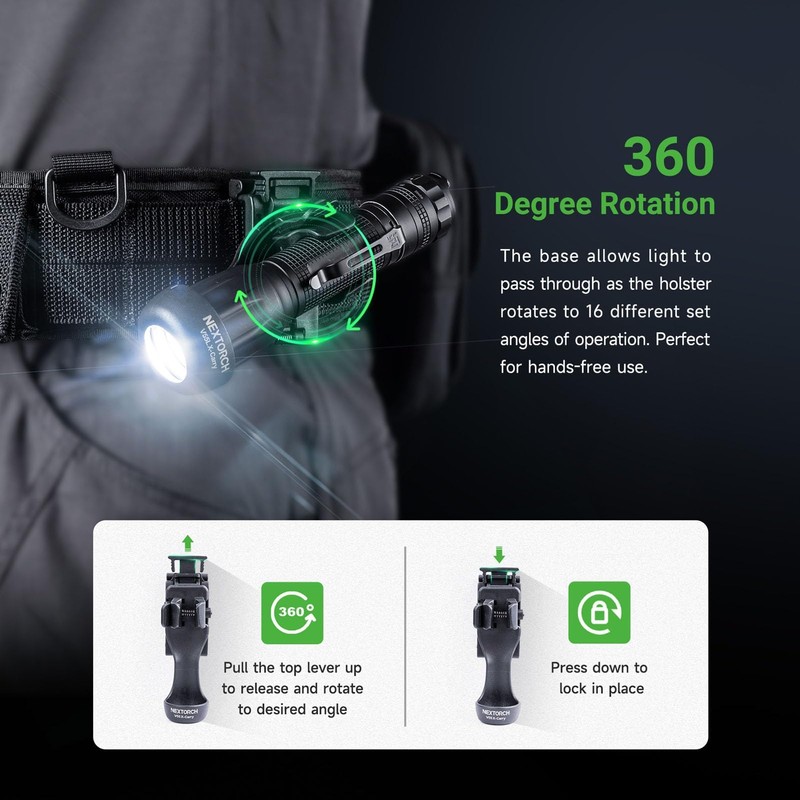 - 【360 degree roration,16 locking positions】V55 flashlight holster is the upgrade version can rotate for 360 degree and lock in one of 16 positions ,can find the right angle for your need. Remember to adjust the holder width via twisting the pin before putting your flashlight in the holster.